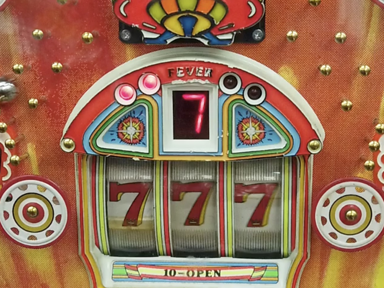 大当りの仕組みはシンプルで、ドラムに7が3つ揃い、さらに上部デジタルにも7が表示されると最大10ラウンドの大当りとなります。